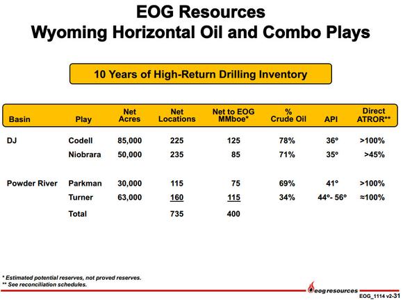 Particularly impressive, EOG is not only drawing more oil out of its legacy shale plays, but it finds new plays to drive future growth. In the past year alone, the company uncovered five additional oil targets, including four in Wyoming. Those four plays alone are estimated to hold about 400 million barrels of oil equivalent, as shown on the slide below.