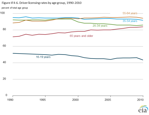 While miles driven clearly peaks during our prime working years, what's interesting is to see the trends on the two other ends of the spectrum. As this next chart shows there have been two notable shifts in the driving populations. First, fewer teens are getting their license, and second, there's a growing percentage of seniors that are keeping theirs longer.