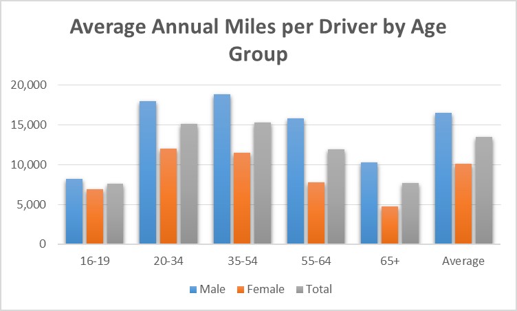Not only is there quite a difference between the miles driven by men and women, but there's a very pronounced difference by age range. As we see in the chart below, miles driven per year peaks in the 35-55 age bracket for men while mileage driven for women peak in the 20-34 age bracket.