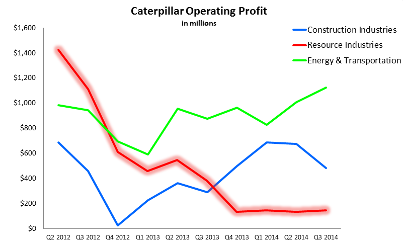 As you can see, despite sales moving in the right direction, year-over-year comparisons remain negative. Resource industries was once Caterpillar's bread-and-butter business segment, and generated significantly more operating profit than its other business segments as recently as 2012.