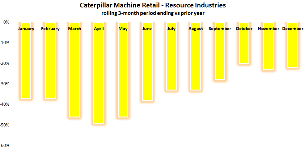 As this chart shows, Caterpillar's construction industries sales have completely reversed over the last year. When combining the resource industries and construction industries segments, Caterpillar's global machine retail sales checked in 12% lower for the three-month rolling period ending in December, compared to last year. That is worse than November's decline of 10% and October's 9% slide.