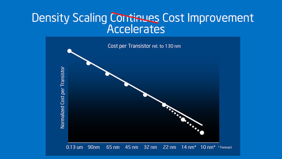 With all this in mind, if Intel did disclose "too much," it might have been about its 10-nanometer technology. At the 2013 investor meeting, Intel claimed it would actually accelerate its cost-per-transistor improvements at the 10-nanometer node relative to the 14-nanometer node:
