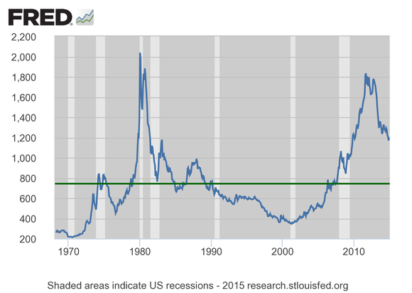 As the chart makes clear, at $1,300 per ounce, gold remains significantly above its long-term average price, in real terms, despite having fallen sharply from its September 2011 peak.