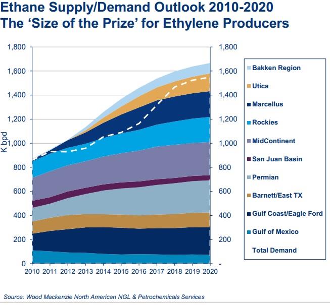 However, on a longer-term basis, a MarkWest acquisition could greatly boost Kinder's growth prospects. For example, analysts are expecting MarkWest's distribution growth rate over the next five years to be 133% higher than Kinder's dividend growth rate over that same time period. That's because of MarkWest's immense long-term growth potential in two of America's fastest growing natural gas formations and its strong presence in the booming NGL market. In fact, over the next five years the largest growth in ethane, a NGL used by the petrochemical industry, is expected to come from the Bakken, Marcellus, and Utica shale.