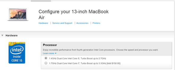 Notice that the base model starts with an Intel Core i5, but that for an additional $150, a customer can move up to a Core i7, which brings about a 20% performance boost. Now, if you look at Intel's "official" pricing on these processor models (the i5-4260U and i7-4650U, respectively, according to AnandTech), the former is priced at $315 and the latter at $426 (in quantities of 1,000).