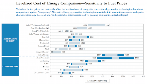 You can see that unsubsidized utility scale solar is still cheaper than diesel, gas peaking, nuclear, and most coal generators. Only natural gas combined cycle is competitive, but even that may be changing.