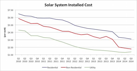 Falling costs will help drive installation growth because whether a solar project is going up on your roof or in a desert in the Southwestern U.S., it's being compared to grid prices, not oil or even natural gas prices.