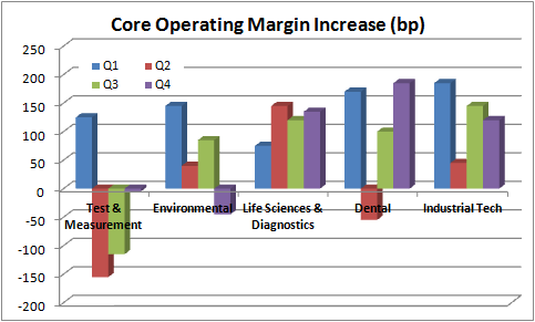 The decline in test and measurement segment margin leads me to my second takeaway. Danaher faced weakness with two higher-margin businesses in 2014: communications (test and measurement) and dental consumables (dental). In fact, operating profit declined by 1.7% for test and measurement in 2014, and CEO Tom Joyce did not indicate that conditions were improving.
