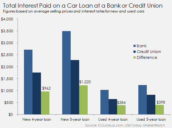 The differences are substantial. On average, used car buyers would save as much as $398 by using a credit union, while new car buyers who pick the lengthiest loan term would save the most -- $1,220.