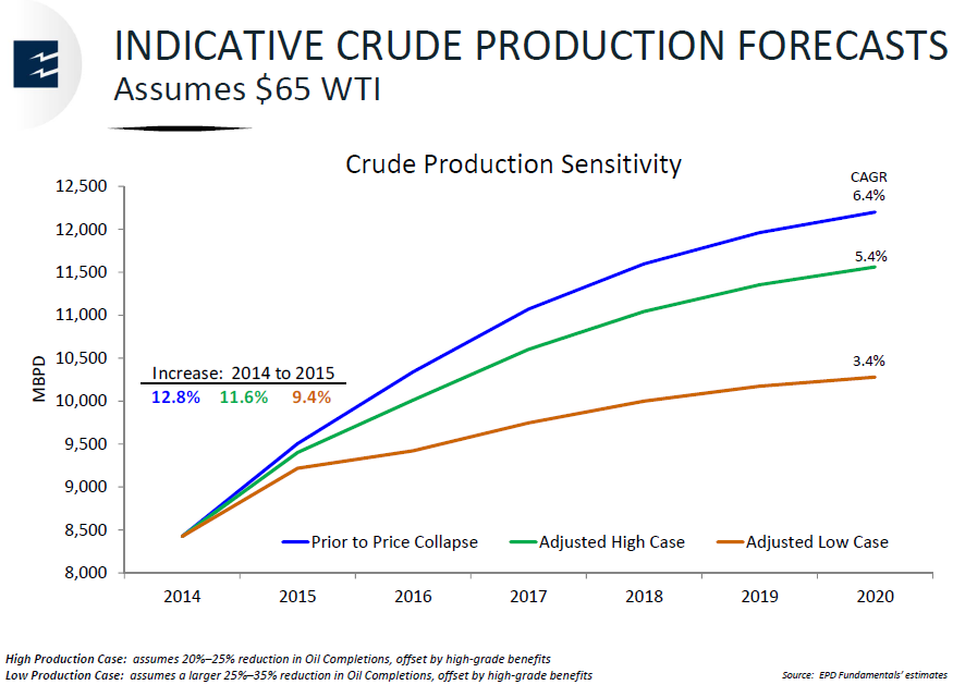 - Decreased prices doesn't necessarily mean less volume. One of the biggest questions surrounding America's oil and gas production is how much the decline in prices will impact drilling and, by default, overall production. Recently, we have seen drilling activity slow and many active rigs have gone offline. However, this does not necessarily mean that we will see a decline in overall production. According to estimates from Enterprise, lowered prices and declining drilling activity will definitely slow production growth, not completely kill it.