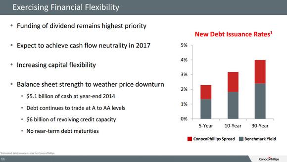 [...] We will also be using our strong balance sheet capacity, both cash balances and increased borrowings to provide funding this year and next. ... We have ready access to the credit markets and our debt continues to trade at levels between those of A and double-A rated companies. The chart on the right [see slide below] shows indicative borrowing rates for any new issuances in today's markets. ... As we assess commodity price environments both in 2015 and for the next few years, we think it's unlikely that we'll need to increase our debt to a level that would cause our credit ratings to slip out of the single-A credit rating range, although it could move lower within the A range if we stay at current commodity price environments for a prolonged period. Our current debt-to-capital ratio is about 30%. We're willing to let that rise, if necessary, as we move the Company to a balance of cash flows, capital expenditures and dividends in 2017.