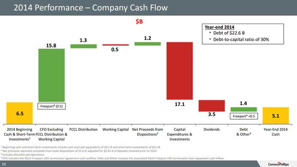 Management also said repeatedly it is focused on making ConocoPhillips cash flow neutral by 2017. In fact, Lance placed it as the No. 2 priority behind sustaining the dividend. As the following slide illustrates, the company has a way to go: In 2014, it outspent cash flow plus asset sales by $1.4 billion, requiring it to take on some additional debt.