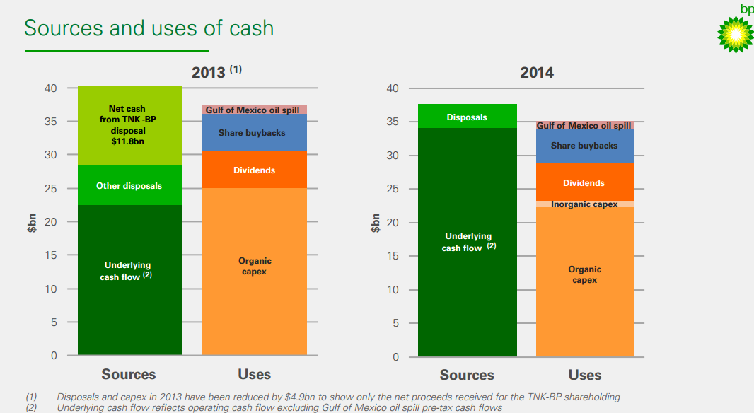 Here's what really matters: In the fourth quarter, BP generated $7.2 billion in cash flow from its continuing operations, which was up 33% from the same quarter last year. Through full-year 2014 the company generated $32.8 billion in operational cash compared to $18.5 billion in 2013. This large uptick enabled the company to cover all of its capital expenditures, dividends, and share buybacks with operational cash; not requiring debt issuance for those costs is a rarity in the Big Oil space right now.