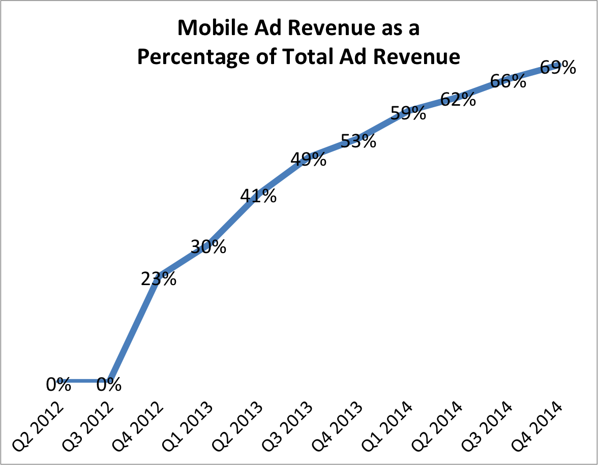 In Q4, Facebook's mobile ad revenue as a percentage of total ad revenue hit an all-time high of 59%, up considerably from the year-ago proportion of 53%.