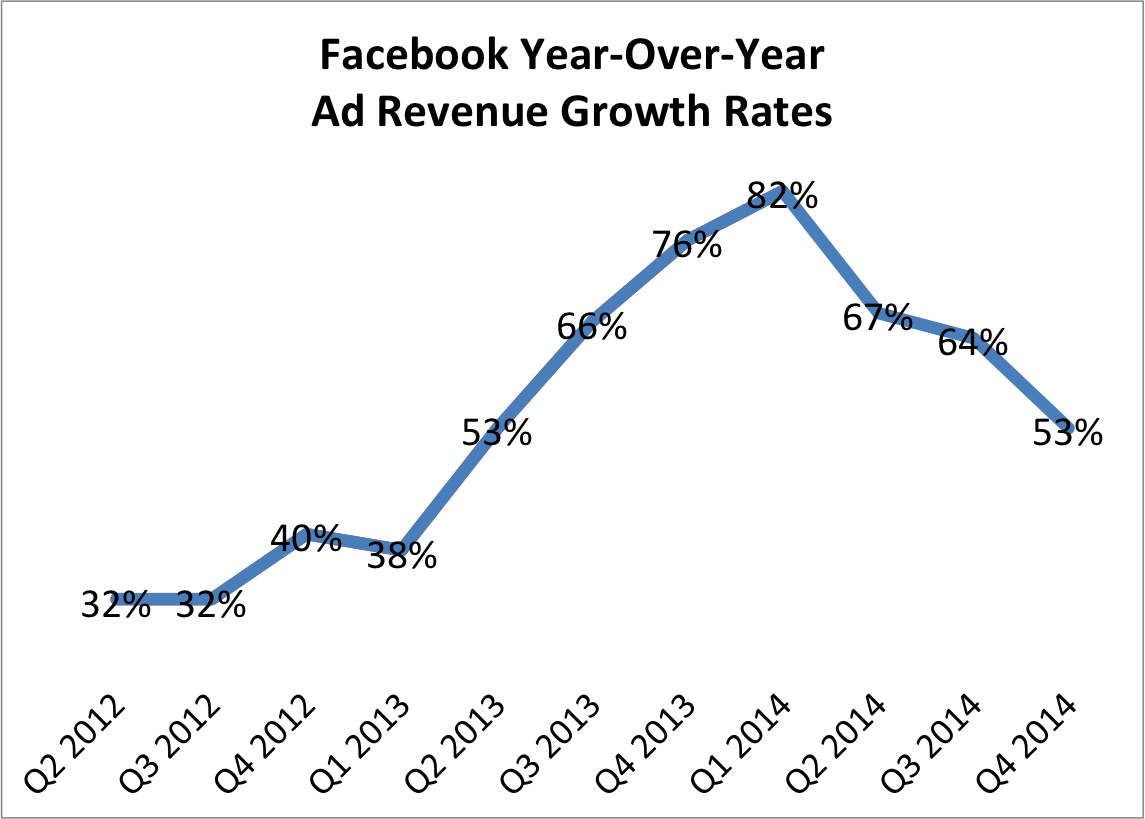 To be fair, Facebook was subject to meaningfully unfavorable currency fluctuations during the quarter, but even after adjustments, the company's revenue growth rates are still decelerating. Excluding the impact of year-over-year changes in foreign exchange rates, Facebook's revenue from advertising in Q4 would have increased 58%, still down 6 percentage points from year-over-year revenue growth of 64% in Q3.