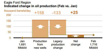 According to the U.S. Energy Information Agency's latest productivity report, it sees roughly 300 drilling rigs running this month in the Eagle Ford, and those rigs will add 158,000 barrels of new daily oil production. However, the decline in oil production from legacy wells of 133,000 barrels of daily production will result in a net gain of just 25,000 barrels of oil added to the daily total. So the rig count wouldn't need to fall all that much before overall production would stop growing, and even decline. Once the market starts to see this begin to happen it could fuel a rally in oil prices, as it would suggest that the oversupply issues are going to begin to fade.