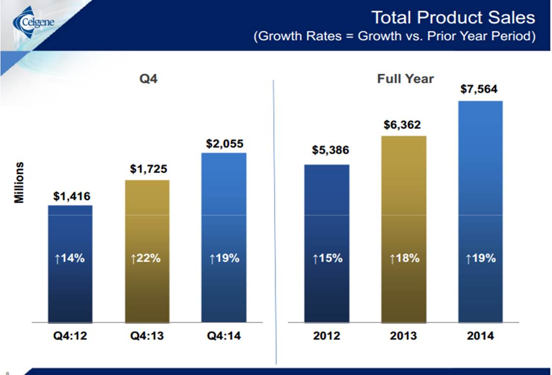 Celgene Corp. (CELG +0.00%) is generating monstrous levels of growth in terms of its top and bottom-lines. Per its recent fourth-quarter earnings release, for example, the company saw total product sales rise by a staggering 19% year over year, topping $2 billion in quarterly revenue for the first time in its operating history.