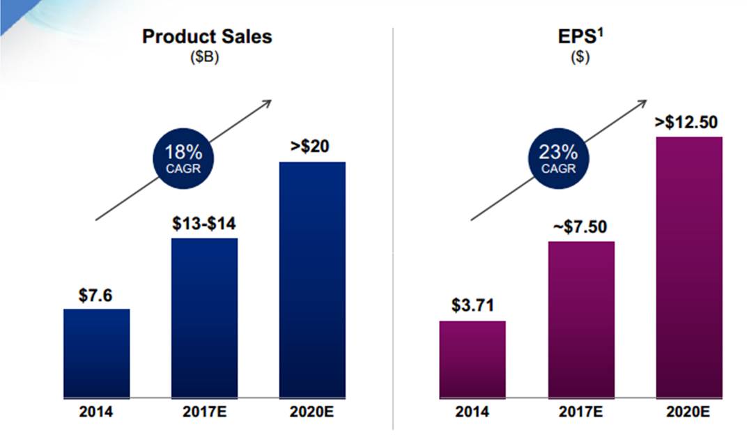 The recent label expansions for Revlimid, Abraxane, and Otezla gave management the confidence to provide a long-term financial outlook during the quarterly call, estimating that sales will grow by more than 18%, on an annualized basis, until at least 2020. The company thus expects total sales to exceed $20 billion by the end of the decade: