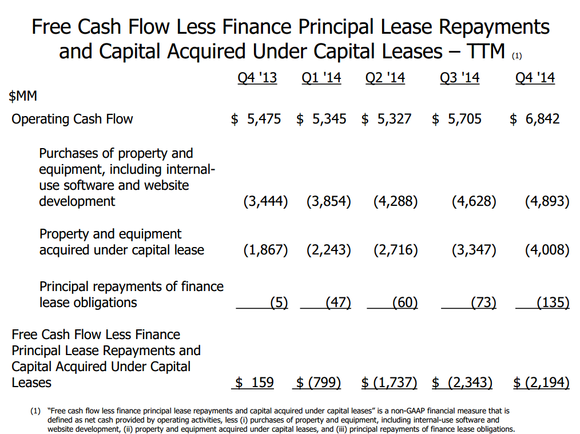 This is essentially the same slide that Amazon shows every quarter, with one important difference: The second footnote points to some additional free cash flow measures in the appendix, including one which adjusts for its massive spending via capital leases. This is the first time that Amazon has actively pointed out its capital lease activity beyond the required disclosures in its financial statements. What does this slide look like?