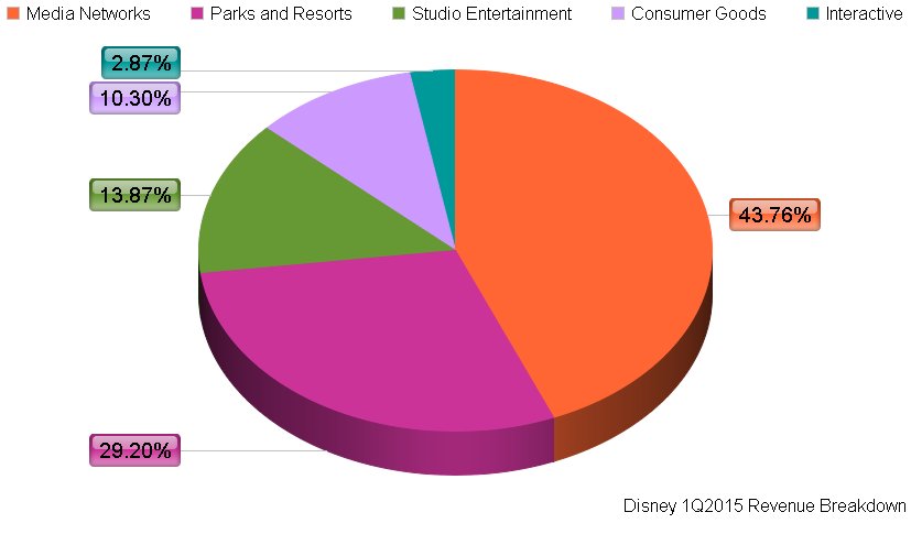 Quarterly revenue at Disney's two other segments -- studio entertainment and interactive -- respectively declined by 2% and 5% year over year. The studio entertainment segment's decline wasn't surprising, since Frozen -- the highest-grossing animated film in history -- was released in the prior-year quarter.