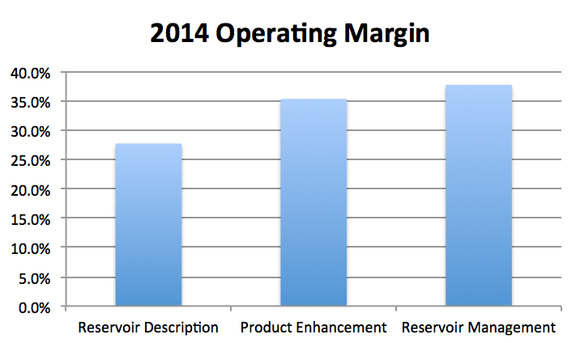 It's no surprise that management has focused on growing the higher-margin segments, and their efforts have paid off. During the past five years, low-margin Reservoir Description work has grown 4.5% per year. Compare that to high-margin segments Product Enhancement and Reservoir Management, which have expanded 15% and 13.7% annually.