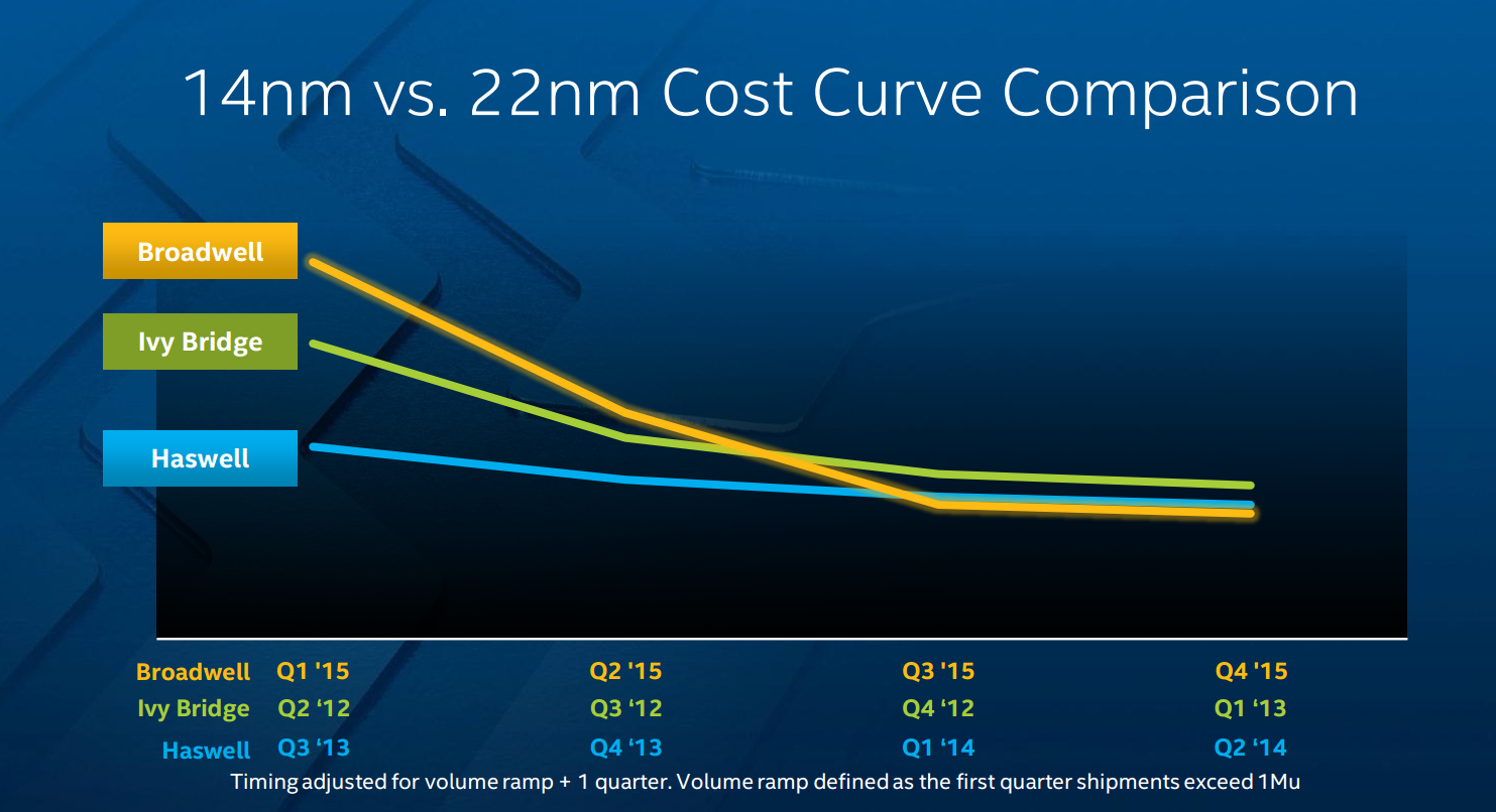 Additionally, notice that by the third quarter of 2015, Intel's 14-nanometer Broadwell is expected to be slightly cheaper to build than Haswell was by the second quarter of 2014.