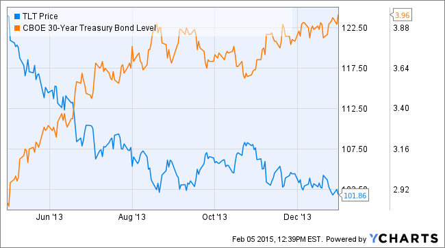 Instead, I'm simply trying to send a warning to bond investors, and particularly long-dated bond ETF investors, that what they (you?) might believe to be a safe investment could actually be fraught with risk. That's due to the relationship bond prices have with interest rates: As rates rise, bond prices fall. And the prices of longer maturity bonds, as represented by the iShares 20+ Year Treasury Bond (TLT 0.54%) ETF, can fall dramatically when rates increase:
