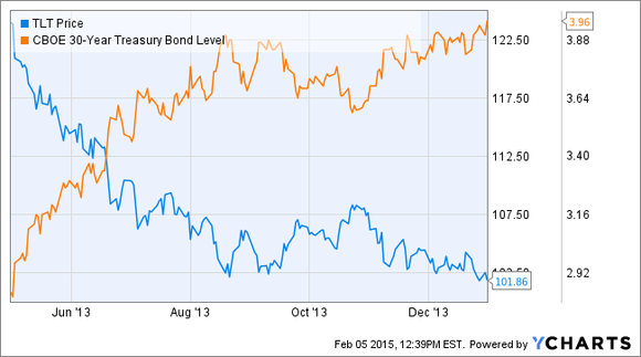 Instead, I'm simply trying to send a warning to bond investors, and particularly long-dated bond ETF investors, that what they (you?) might believe to be a safe investment could actually be fraught with risk. That's due to the relationship bond prices have with interest rates: As rates rise, bond prices fall. And the prices of longer maturity bonds, as represented by the iShares 20+ Year Treasury Bond (TLT 0.82%) ETF, can fall dramatically when rates increase: