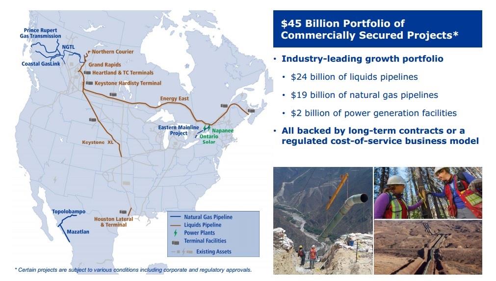 The prospects of major growth projects such as Keystone XL were expected to accelerate TransCanada's dividend growth and provide a major growth catalyst for future market-beating returns. The current annual dividend of $1.65 per share -- a 3.5% yield -- represents only 36% of the company's operating cash flow, and 30% of its EBTIDA, indicating that even should Keystone XL be permanently canceled, the payout would not need to be cut. This is because TransCanada's cash flow is mostly protected by long-term contracts, and the company is also diversified into natural gas pipelines and power generation.