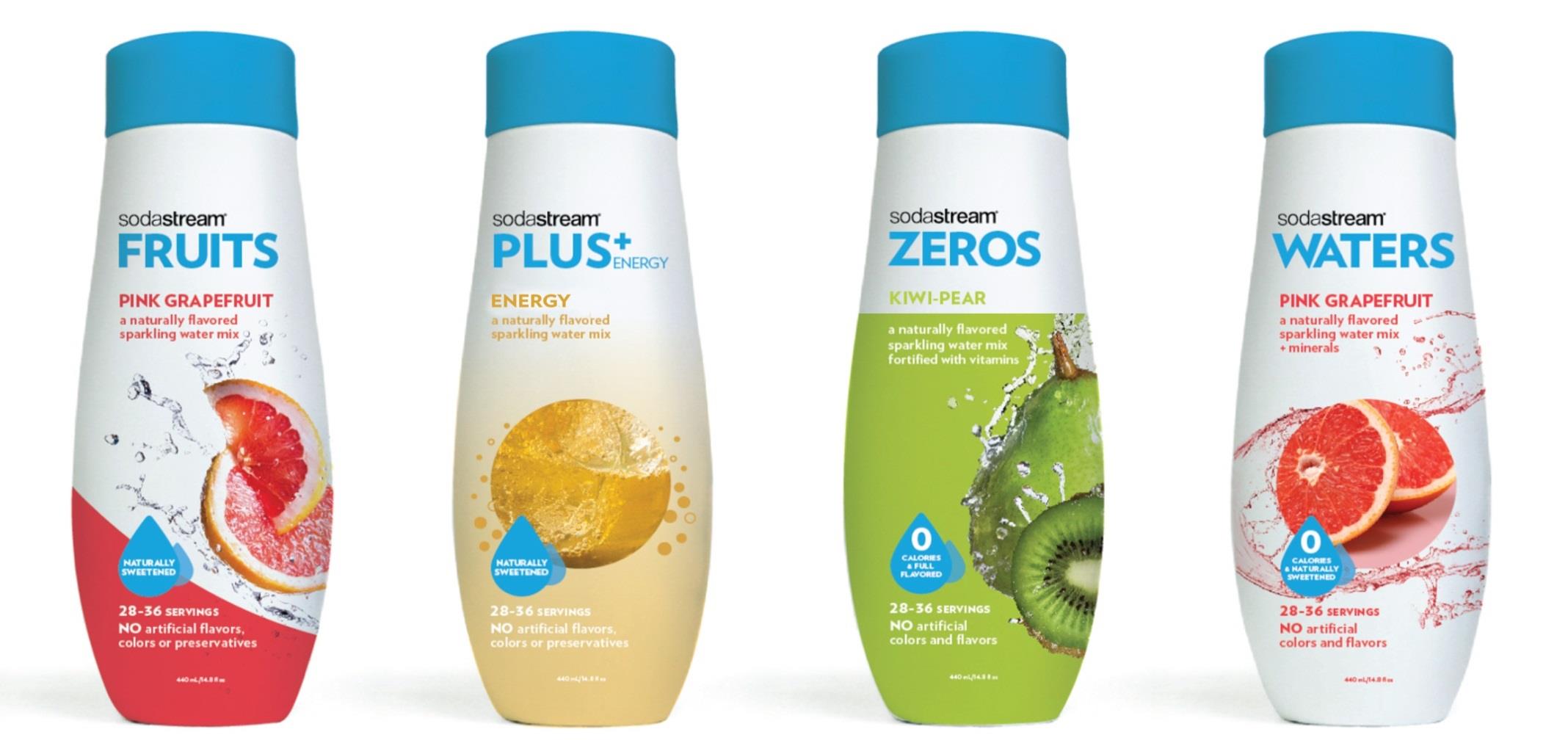 SodaStream's ditching the detergent-like bottles of syrup for sleeker ones with new health-oriented varieties. Source: SodaStream.