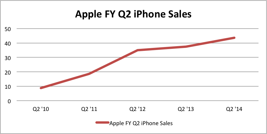 Viewed through the lens of year-over-year growth, it becomes more apparent that hitting 50 million or so iPhone shipments would actually represent a fairly strong performance for Apple by essentially matching last year's Q2 growth rate. Especially as investors continually worry that Apple's increasingly massive scale will eventually lead to slowing growth, achieving greater than 15% growth once again actually seems quite impressive.