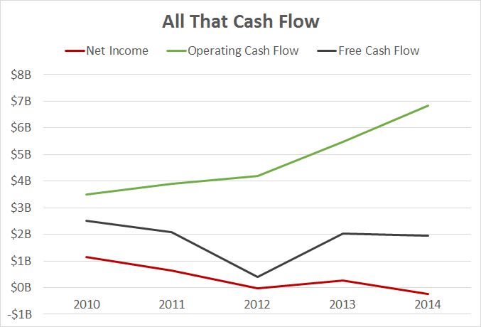 But this doesn't explain how Amazon has managed to continually grow its operating cash flow despite declining net income. From 2010 to 2014, while net income declined from a positive $1.15 billion to a loss of $241 million, operating cash flow nearly doubled, from $3.5 billion to $6.8 billion. Surely, this operating cash flow growth means that Amazon must be doing something right. Right?