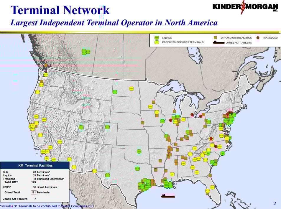 On the surface, Kinder Morgan's most recent purchase looks like a tiny deal. It's paying $158 million for three terminal sites in the U.S. and an undeveloped piece of land. That's really pocket change for the $130 billion behemoth. However, the company sees the deal as immediately accretive to its earnings, which will further strengthen an already rock-solid divided. The deal also adds to the company's leading North American terminal position, which is detailed on the following slide.