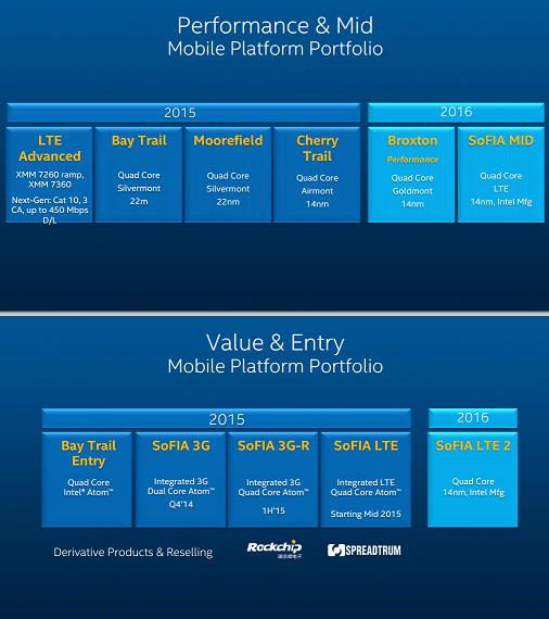 At Intel's 2014 investor meeting, the company displayed the following two product road maps outlining the near-term future of its mobile product portfolio:
