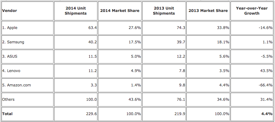 The high-level silver lining is that the tablet market as a whole eked out a small gain for the year. Heading into 2015, this decelerating growth shows no signs of stopping. The tablet market is expected to grow a mere 1% in 2015, according to research firm Gartner, which doesn't quell concerns about long-term growth potential.