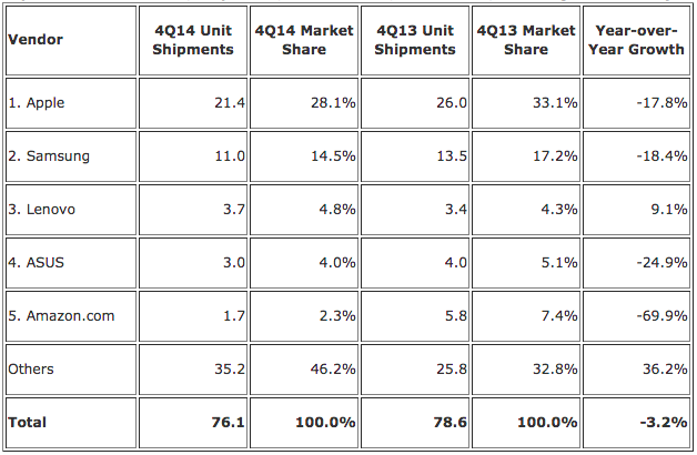 Last week, market research firm IDC released its estimates of the tablet market's evolution for the full-year 2014 and the fourth quarter. The results proved far from encouraging.