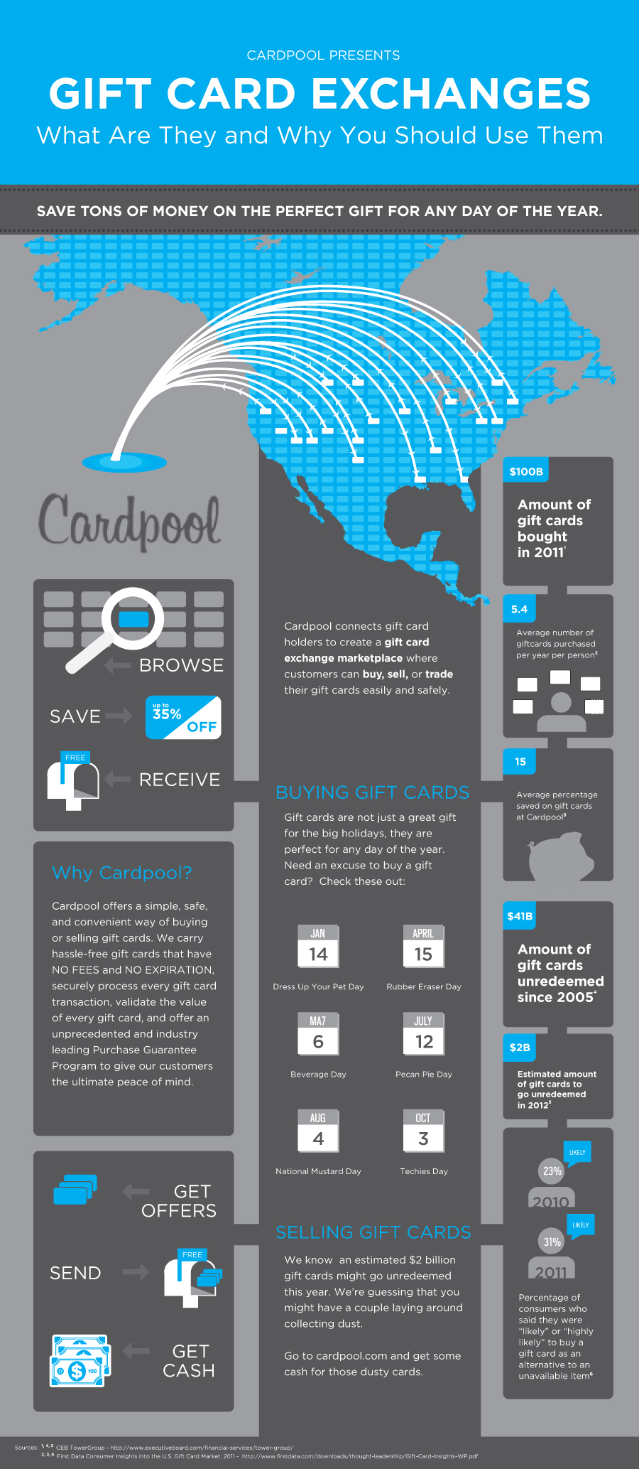 In response to the demand for ways to trade unwanted gift cards, specialized gift-card exchange websites have sprung up to help facilitate transactions. Sites like Cardpool, CardHub, and Gift Card Granny all make it possible for you to sell gift cards and get a certain percentage of their face value back in cash. Again, how much you'll get depends on the popularity of the card, and because these gift-card exchanges also cater to customers who want to buy gift cards at a discount, you can generally get a good idea of the prevailing rates for a certain store's gift cards just by looking at recent transactions.