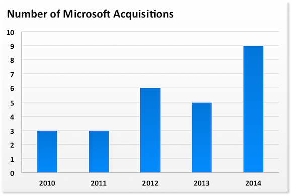 Not long ago, Microsoft was making big, flashy acquisitions that could potentially catapult it into new areas. Sure, the September acquisition of Mojang for its Minecraft franchise made headlines at $2.5 billion, but it still pales in comparison to the massive acquisitions of Skype (May 2011 for $8.5 billion) or the Nokia handset business (September 2013 for $7.2 billion).