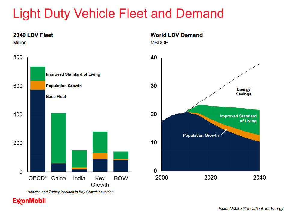 The world actually is poised to curtail its insatiable demand for oil used to power light duty vehicles like cars and trucks. A combination of fuel efficiency gains and the emergence of hybrids and electric vehicles will more than offset future demand growth from emerging market economies as well as overall population growth. Even oil companies like ExxonMobil (XOM 0.22%) readily admit that this trend is coming, which why it projects that the world see declining demand for oil used in light duty vehicles starting as soon as the next decade.