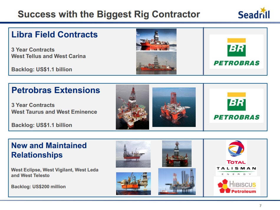 In the company's third-quarter release it noted that subsequent to the quarters end that it received confirmation from Petrobras that it had approved the contract awards for Seadrill's West Tellus and West Carina drillships to be used in the Libra Field. This was a three year contract worth up to $1.1 billion. In addition to that, it also announced that Petrobras approved the contract extensions for the West Eminence and West Taurus semi-submersibles. These contracts were also for three years and upwards of $1.1 billion. We can see both awards, as well as some smaller additions to the backlog, on the following slide.