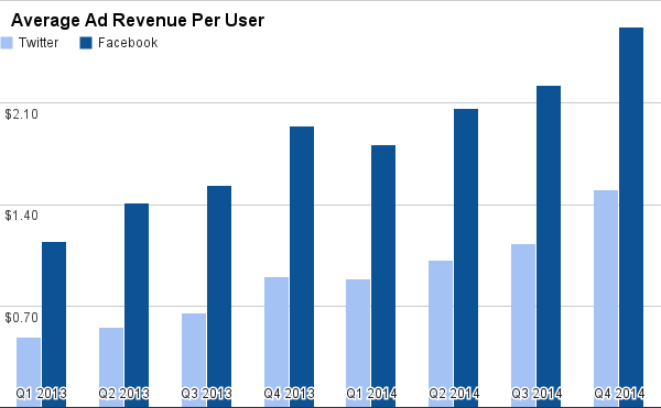 Both Facebook and Twitter have successfully grown their average ad revenue per user phenomenally over the last couple years. Thus far, Facebook's ad revenue per user has stayed well ahead of Twitter's, although Twitter is starting to close the gap. Notably, a few surprising results from Twitter's fourth quarter results indicate the company may make even more progress closing that gap in 2015.