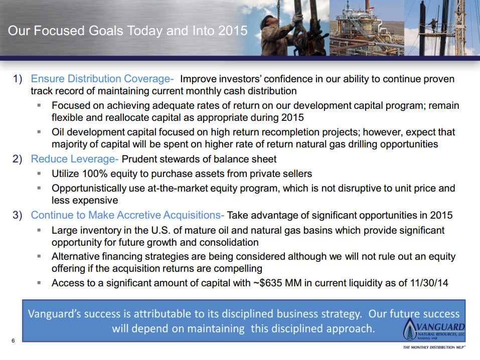 Heading into 2015, Vanguard Natural Resources set three goals that it wanted to accomplish this year in order to address issues that cropped up when the price of oil collapsed. Those goals are detailed on the following slide.