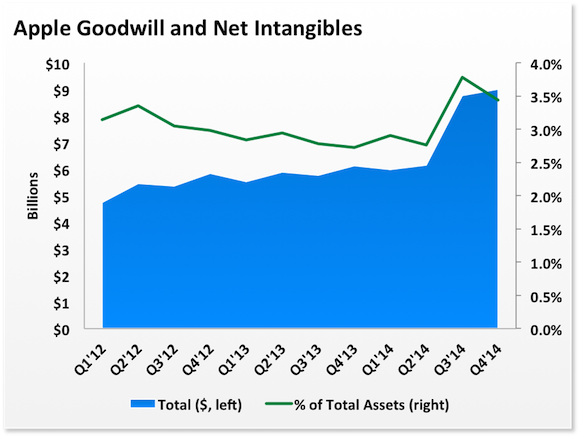 One of the biggest benefits for adopting a conservative acquisition strategy is minimizing the amount of goodwill and intangibles that sit on the balance sheet. This reduces the risk if acquisitions don't work out well. Apple is currently carrying just $9 billion in total goodwill and intangibles, or 3.4% of total assets, with much of that coming from Beats alone.