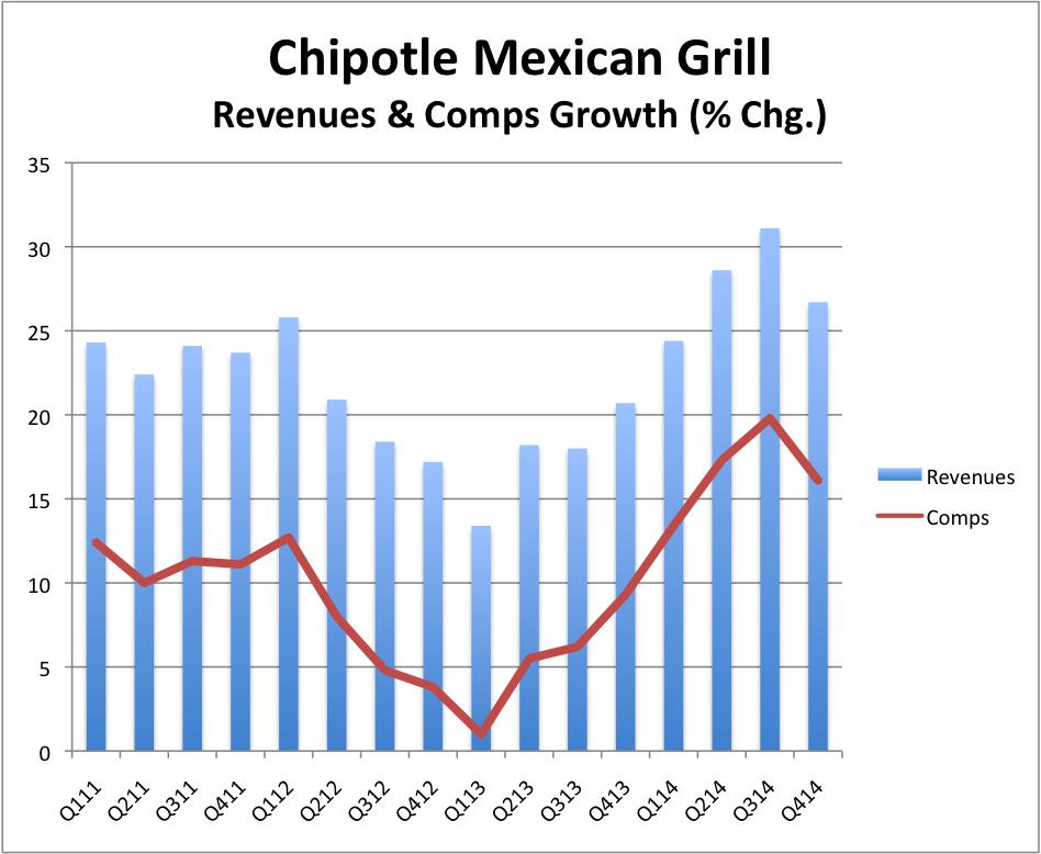 As its fourth-quarter earnings reported showed, Chipotle is still a potent force. Revenues jumped almost 27%, and comparable-store sales were over 16% higher, but the ability to continue growing exponentially higher may have peaked. We're not seeing a company in danger by any stretch, rather it's one that is mature and faces a lot of new competition.