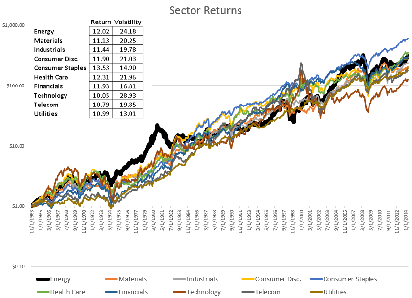 My friend Patrick O'Shaughnessy shows this with a chart of industry returns since 1963. Boring old consumer staples did the best, by far. Exciting new technology did the worst, by far: