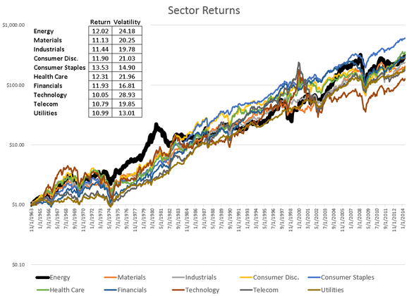 My friend Patrick O'Shaughnessy shows this with a chart of industry returns since 1963. Boring old consumer staples did the best, by far. Exciting new technology did the worst, by far: