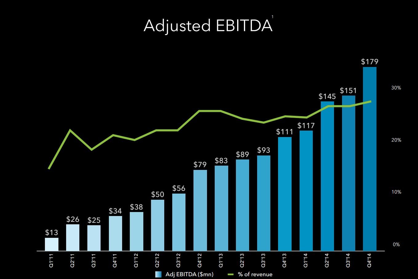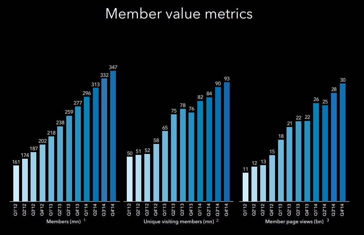 As of the fourth quarter of 2014, LinkedIn has 347 million registered users, a year over year increase of 25%. Unique page views grew 34% during the quarter, well ahead of membership count, which is reflecting increasing engagement from members. Corporate solution customers grew 38% versus the same quarter in the prior year to 33,271 accounts. When it comes to size and staying power, LinkedIn has clearly gone through the inflection point.