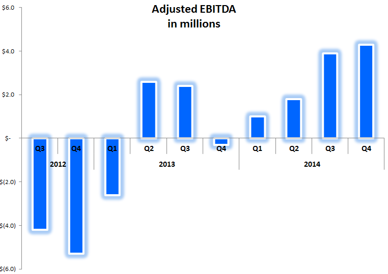 TrueCar's net loss widened from a $7.6 million loss in the fourth quarter of 2013 to a $9.8 million loss in the most recent quarter. However, TrueCar's fourth-quarter adjusted EBITDA, or earnings before interest, taxes, depreciation, and amortization, checked in at $4.3 million, an improvement over negative $0.3 million for the fourth quarter of 2013.
