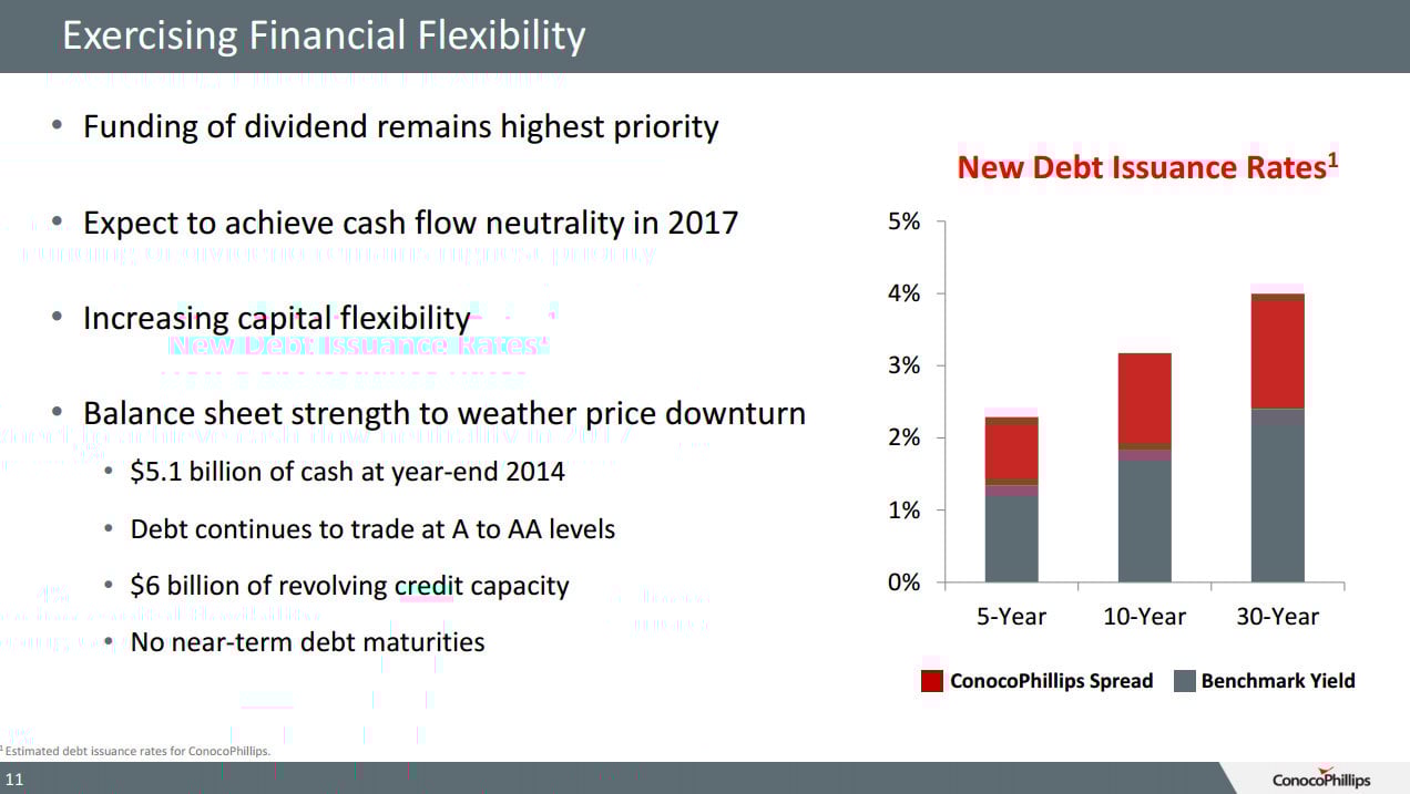 The risk here is that this could stretch the company's balance sheet a little too thin should oil remain weak for several years. The other risk here is that the debt markets could weaken for energy companies as there's the potential for a massive energy bond default wave to hit the industry within a year if the price of oil remains weak. This could make it more expensive for even ConocoPhillips to borrow money at a time when it needs to in order to get it to 2017 when its cash flows are expected to balance out.