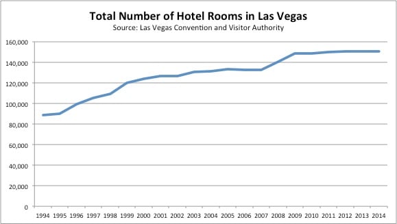 It's interesting to see that the total number of hotel rooms in Las Vegas has been relatively steady in the past couple of years. That might be one reason these companies are able to report rising RevPAR, since more visitors for the same number of total rooms means these companies can start to charge slightly more.